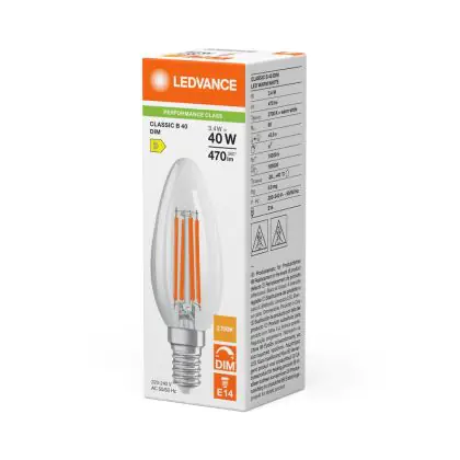 La lampada Ledvance Classic LED E14 Candela Filamento Chiara 3.4W 470lm - 827 Bianco Molto Caldo | Dimmerabile - Sostitutiva 40W è il sostituto perfetto per le tue vecchie lampade 40W con attacco a vite piccolo E14 grazie alla sua tecnologia LED. Passare a LED ti offrirà molti vantaggi!