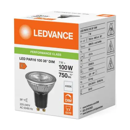 La Ledvance LED PAR16 GU10 Riflettore 7W 750lm 36D - 840 Bianco Freddo | Dimmerabile - Sostitutiva 80W è perfetta per la sostituzione della convenzionale Lampada alogena 80W GU10 con colore della luce 840 Bianco Freddo. Questa Lampada ha una forma Riflettore con un diametro di 50mm. I due perni sono distanti tra loro 10mm. Questa lampada funziona con la 220V-230V e quindi non ha bisogno di trasformatori. Passare a LED ti offrirà molti vantaggi!