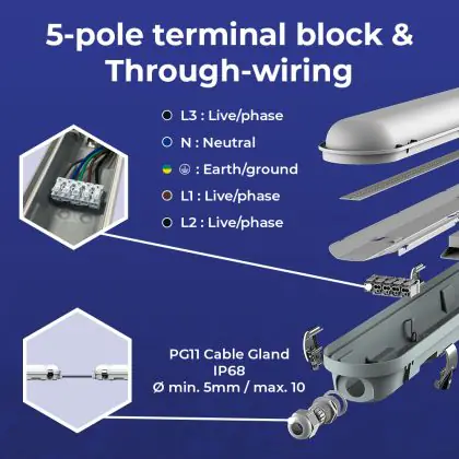 Descrizione Noxion Stagna LED Poseidon V3.0 10-18W 1300-2520lm - 830-865 CCT | 60cm - Cablaggio Entra/Esci (5x2.5mm2)