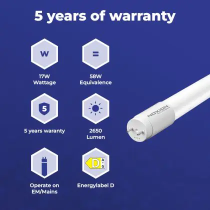 Il Noxion Avant Tubo LED T8 Extreme (EM Mains) High Output 17W 2650lm - 830 Luce Calda | 150cm - Sostitutiva 58W è l’alternativa perfetta per il tubo fluorescente standard 58W nelle plafoniere con un reattore. Con questo tubo LED hai una garanzia di una vita media utile molto lunga e 5 anni Lampadadiretta.it di totale garanzia. .