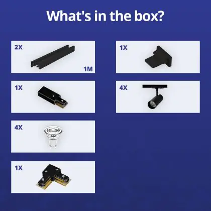 Descrizione Set completo 1-Fase Rail L 1 x 1 Metro Nero | incl. 4x Faretti + GU10 2700K 3W Dimmerabile + Tappo Di Chiusura, Connettore di Alimentazione e L -Connettore